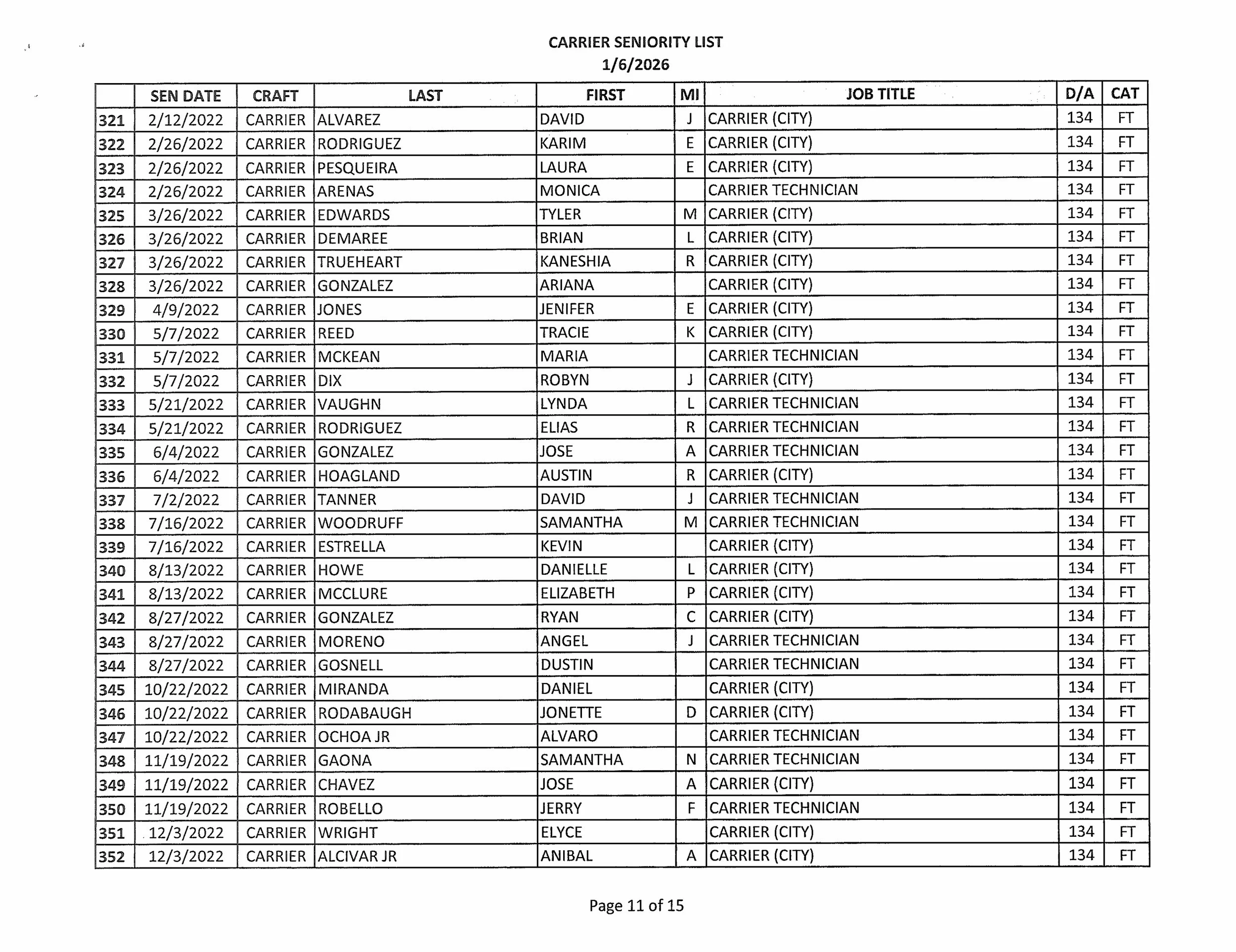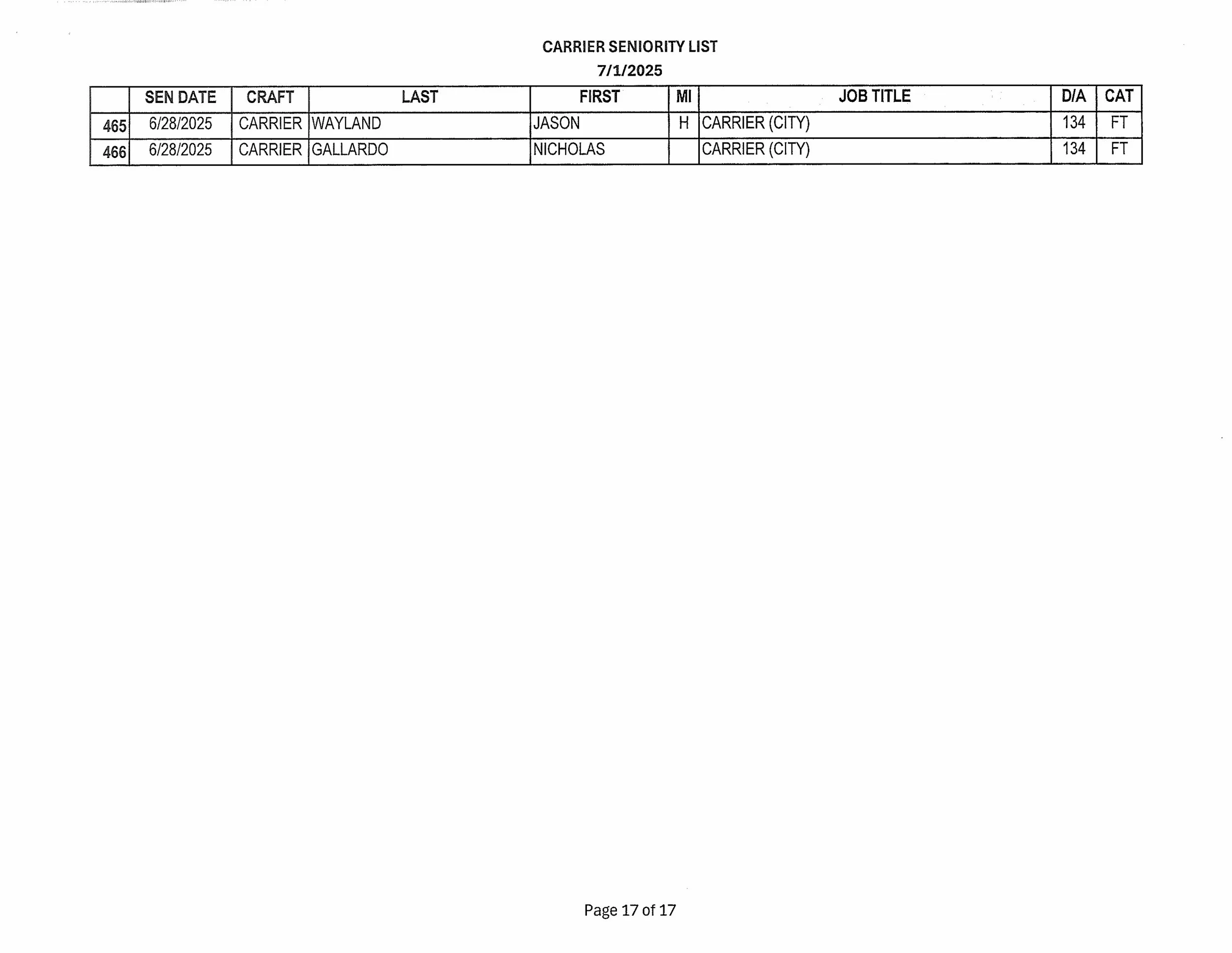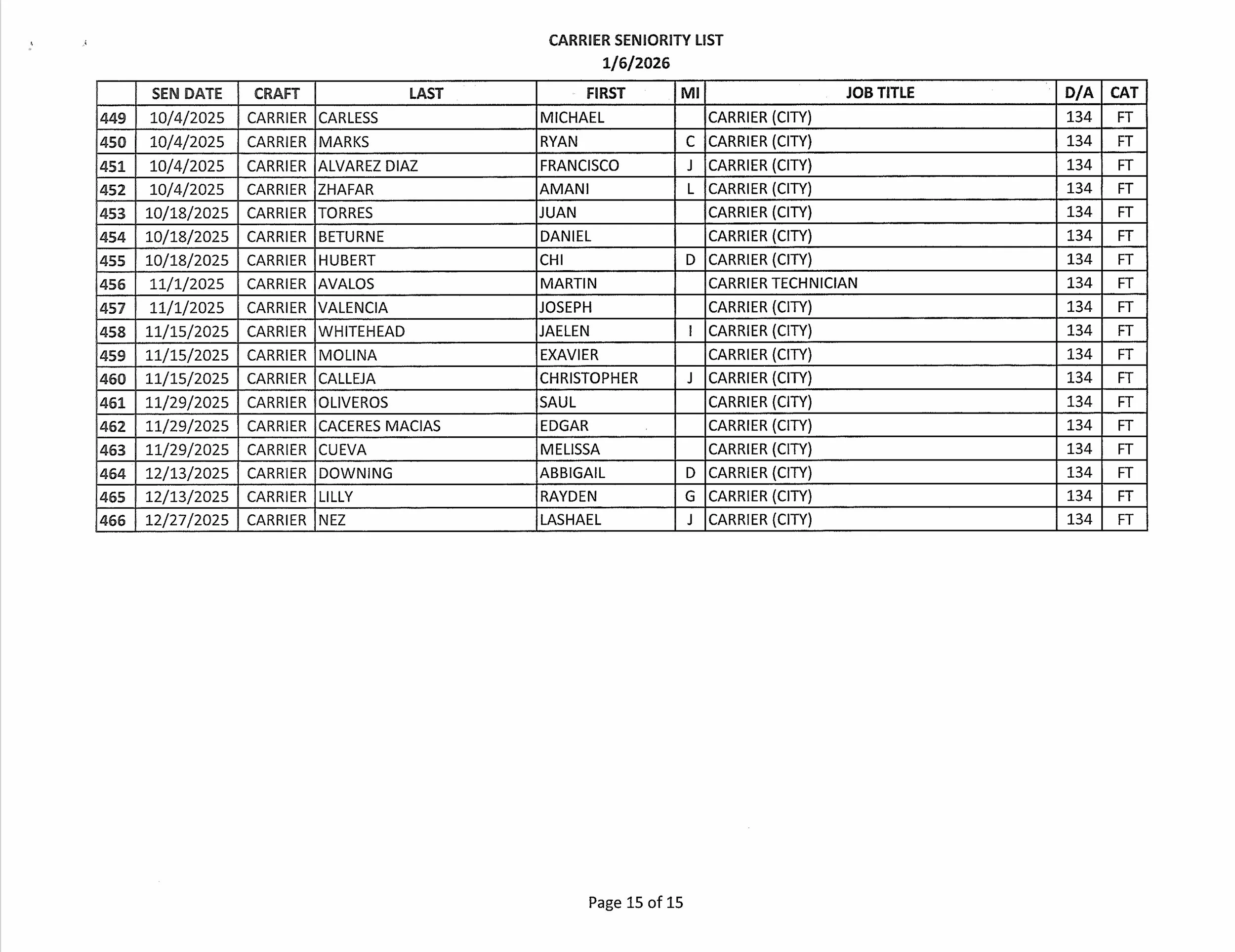 Vacant Carrier List